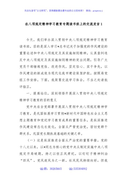 / 在八项规定精神学习教育专题读书班上的交流发言1