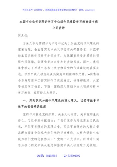 / 在国有企业党委理论学习中心组作风建设学习教育读书班上的讲话
