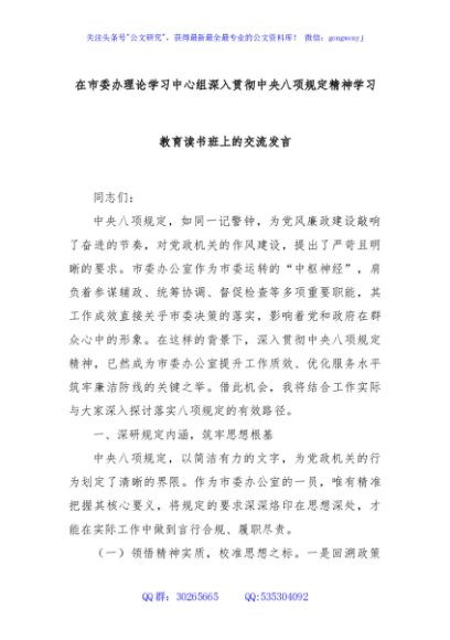 / 在市委办理论学习中心组深入贯彻中央八项规定精神学习教育读书班上的交流发言