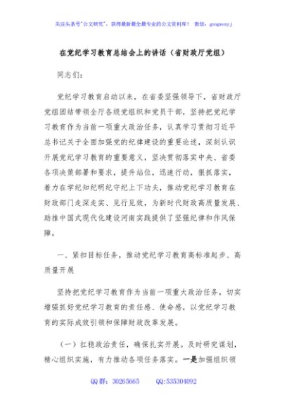 / 在党纪学习教育总结会上的讲话(省财政厅党组)