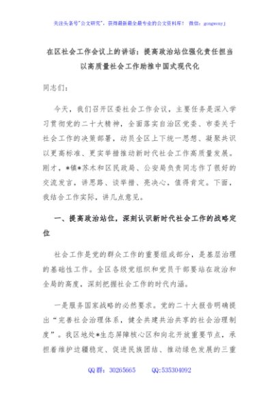/ 在区社会工作会议上的讲话:提高政治站位强化责任担当 以高质量社会工作助推中国式现代化