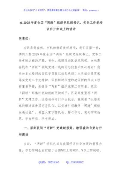 / 在2025年度全区“两新”组织党组织书记、党务工作者培训班开班式上的讲话