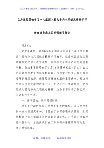 / 在局党组理论学习中心组深入贯彻中央八项规定精神学习教育读书班上的党课辅导报告