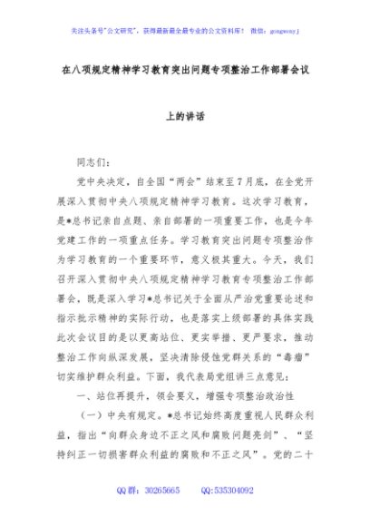 / 在八项规定精神学习教育突出问题专项整治工作部署会议上的讲话