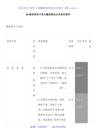 / XX镇党委班子党风廉政建设主体责任清单