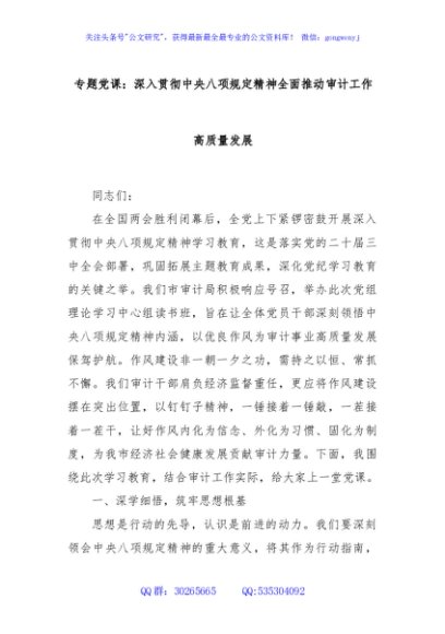 / 专题党课:深入贯彻中央八项规定精神全面推动审计工作高质量发展