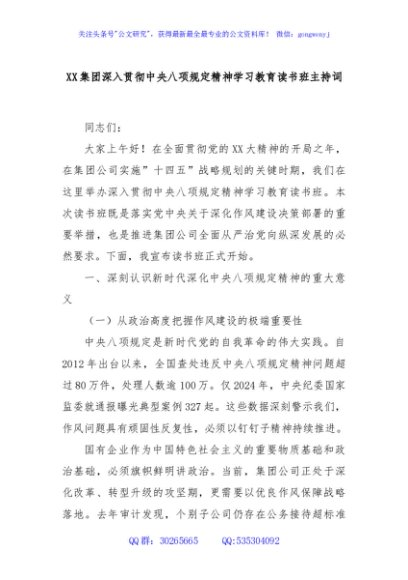 / XX集团深入贯彻中央八项规定精神学习教育读书班主持词