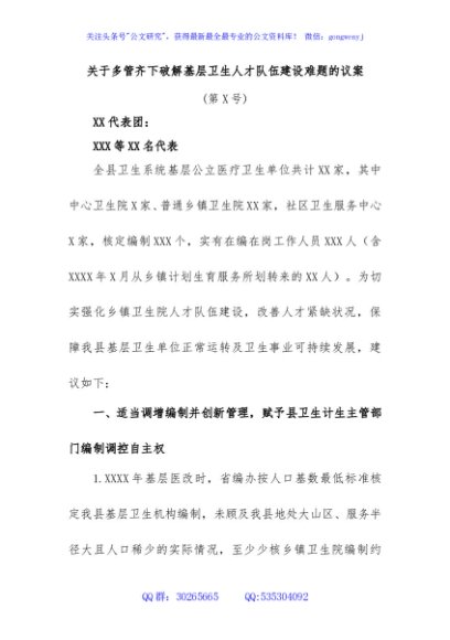 / 关于多管齐下破解基层卫生人才队伍建设难题的议案(第 X 号)