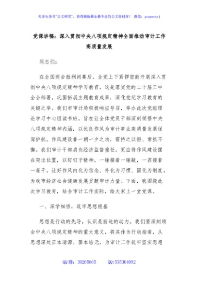 / 党课讲稿:深入贯彻中央八项规定精神全面推动审计工作高质量发展