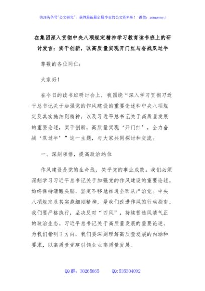 / 在集团深入贯彻中央八项规定精神学习教育读书班上的研讨发言:实干创新,以高质量实现开门红与奋战双过半