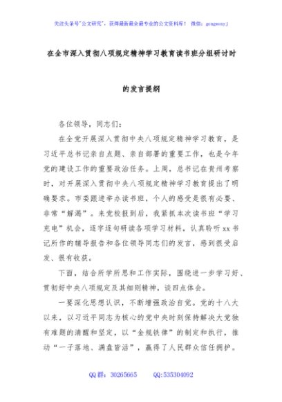 / 在全市深入贯彻八项规定精神学习教育读书班分组研讨时的发言提纲