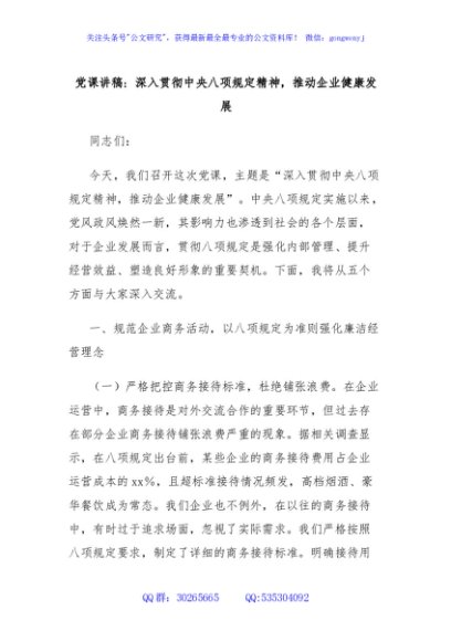 / 党课讲稿:深入贯彻中央八项规定精神,推动企业健康发展