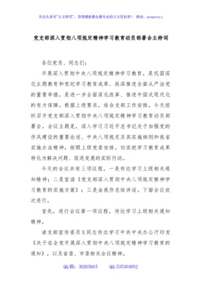 党支部深入贯彻八项规定精神学习教育动员部署会主持词