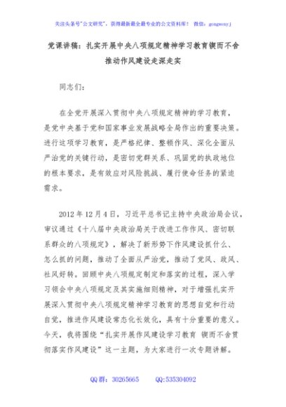 / 党课讲稿:扎实开展中央八项规定精神学习教育锲而不舍推动作风建设走深走实