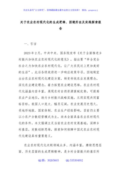/ 关于农业农村现代化的生成逻辑、困境所在及实践探索报告