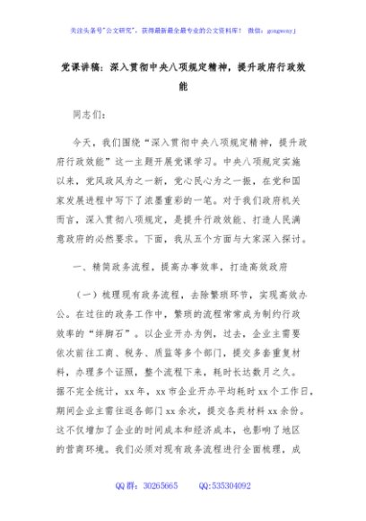 / 党课讲稿:深入贯彻中央八项规定精神,提升政府行政效能