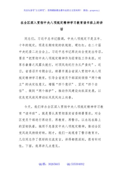 / 在全区深入贯彻中央八项规定精神学习教育读书班上的讲话