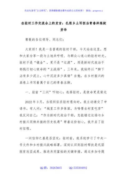 / 在驻村工作交流会上的发言:扎根乡土写担当青春淬炼绽芳华