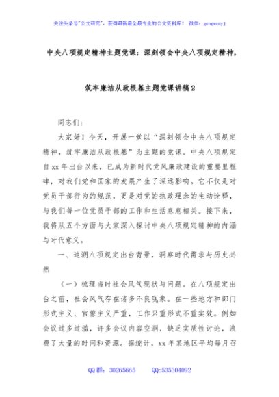 中央八项规定精神主题党课:深刻领会中央八项规定精神,筑牢廉洁从政根基主题党课讲稿2