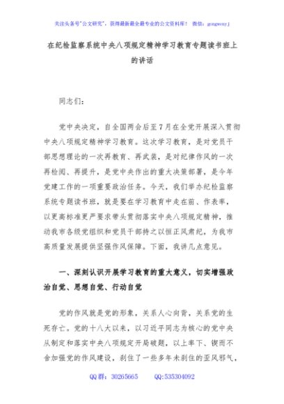 / 在纪检监察系统中央八项规定精神学习教育专题读书班上的讲话