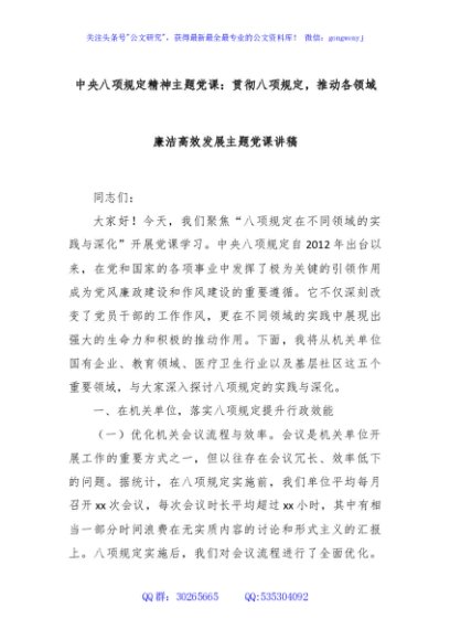 / 中央八项规定精神主题党课:贯彻八项规定,推动各领域廉洁高效发展主题党课讲稿