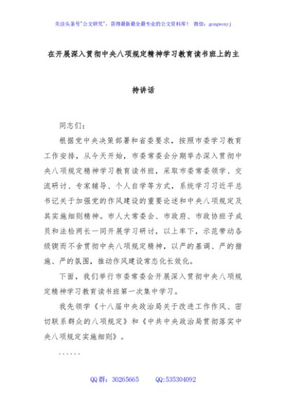 / 在开展深入贯彻中央八项规定精神学习教育读书班上的主持讲话