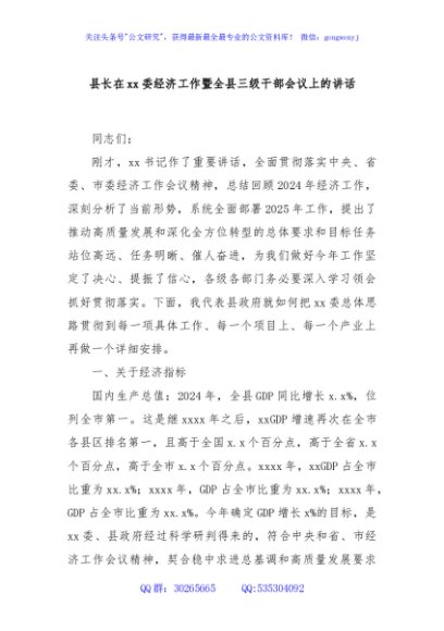 / 县长在xx委经济工作暨全县三级干部会议上的讲话