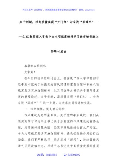 / 实干创新,以高质量实现“开门红”与奋战“双过半”——在XX集团深入贯彻中央八项规定精神学习教育读书班上的研讨发言