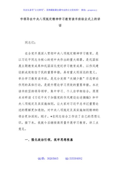 / 市领导在中央八项规定精神学习教育读书班结业式上的讲话