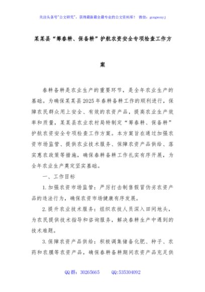 / 某某县“筹春耕、保备耕”护航农资安全专项检查工作方案