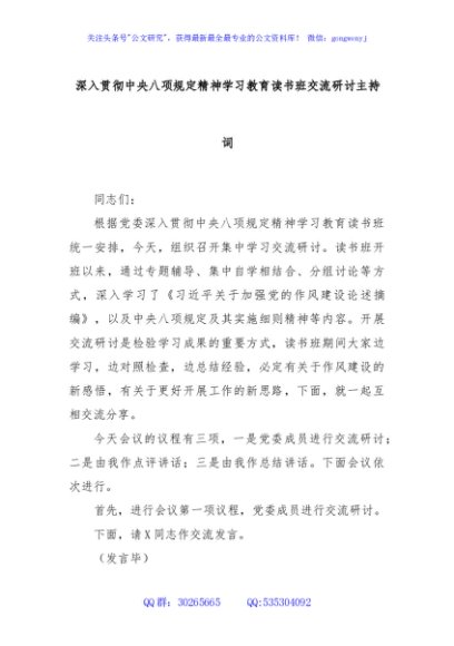 / 深入贯彻中央八项规定精神学习教育读书班交流研讨主持词