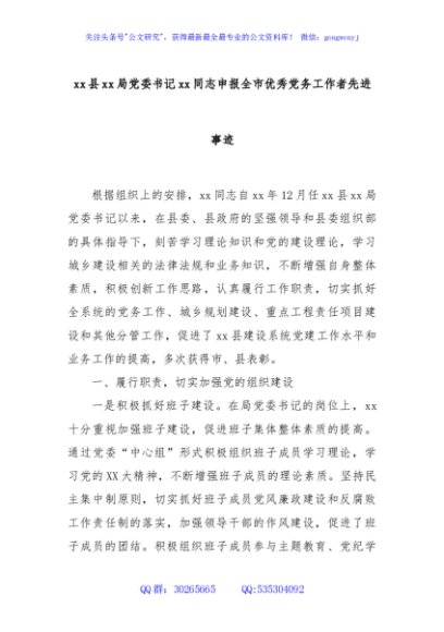 / xx县xx局党委书记xx同志申报全市优秀党务工作者先进事迹