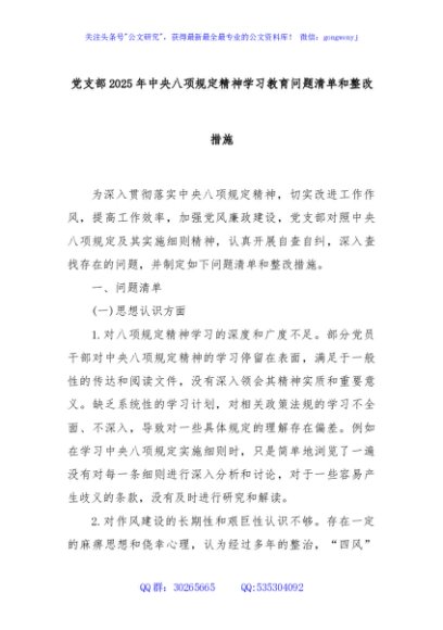 / 党支部 2025 年中央八项规定精神学习教育问题清单和整改措施