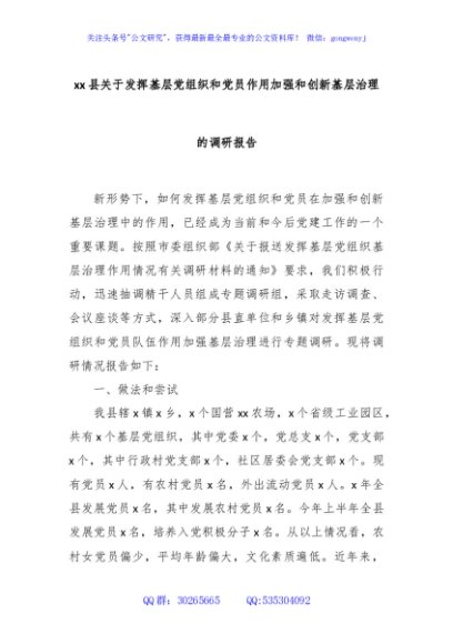 / xx县关于发挥基层党组织和党员作用加强和创新基层治理的调研报告