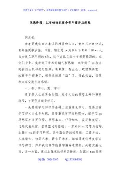 / 党课讲稿:以学铸魂担使命青年逐梦启新程