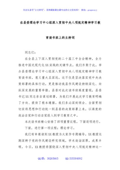/ 在县委理论学习中心组深入贯彻中央八项规定精神学习教育读书班上的主持词