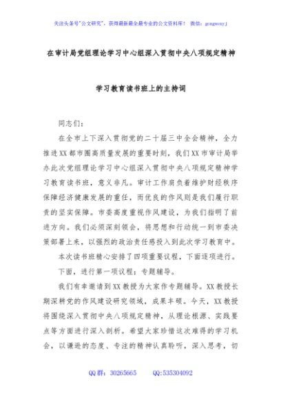 / 在审计局党组理论学习中心组深入贯彻中央八项规定精神学习教育读书班上的主持词
