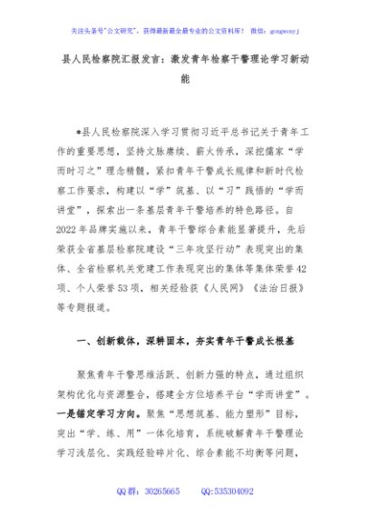 / 县人民检察院汇报发言:激发青年检察干警理论学习新动能