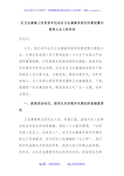 / 区卫生健康工作党委书记在区卫生健康系统作风建设警示教育大会上的讲话