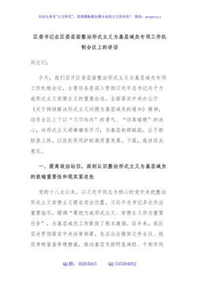 / 区委书记在区委层面整治形式主义为基层减负专项工作机制会议上的讲话