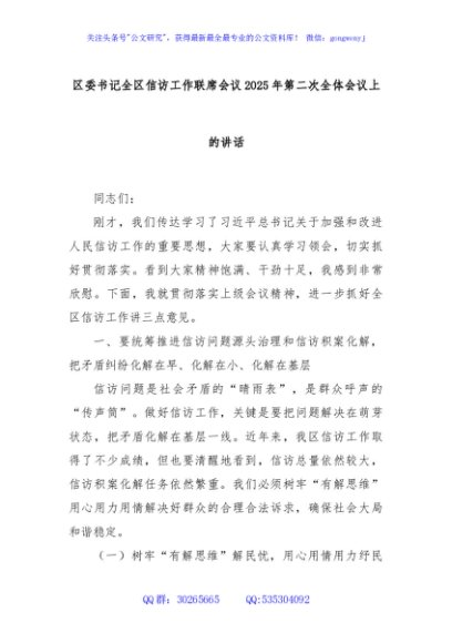 / 区委书记全区信访工作联席会议2025年第二次全体会议上的讲话