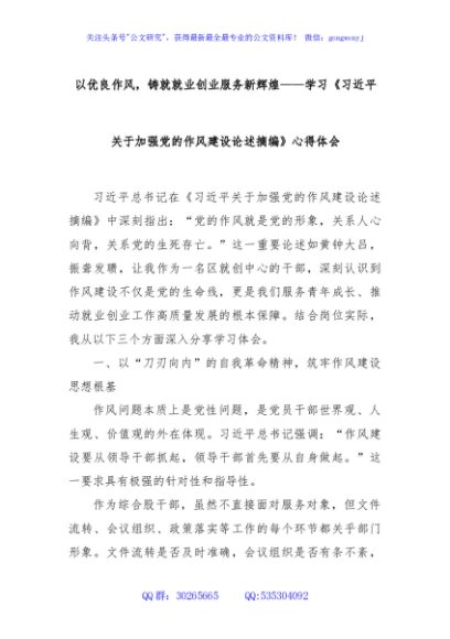 / 以优良作风,铸就就业创业服务新辉煌——学习《习近平关于加强党的作风建设论述摘编》心得体会