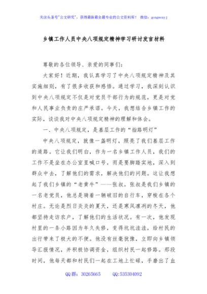 / 乡镇工作人员中央八项规定精神学习研讨发言材料