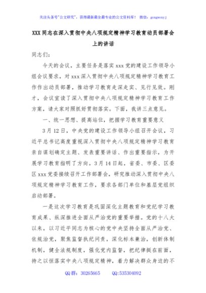 / XXX同志在深入贯彻中央八项规定精神学习教育动员部署会上的讲话