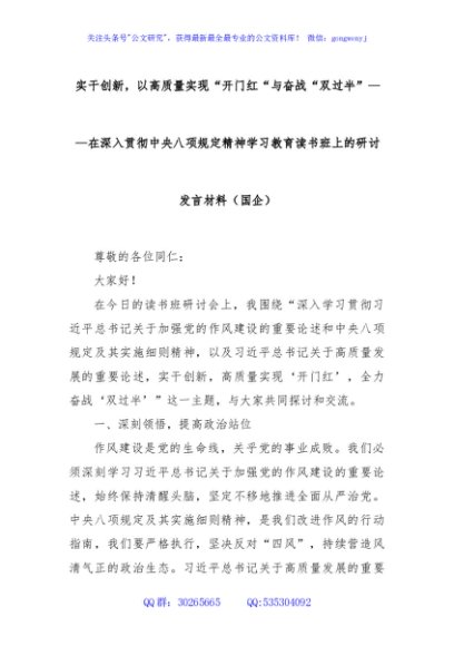 / 实干创新,以高质量实现“开门红“与奋战“双过半”——在深入贯彻中央八项规定精神学习教育读书班上的研讨发言材料(国企)