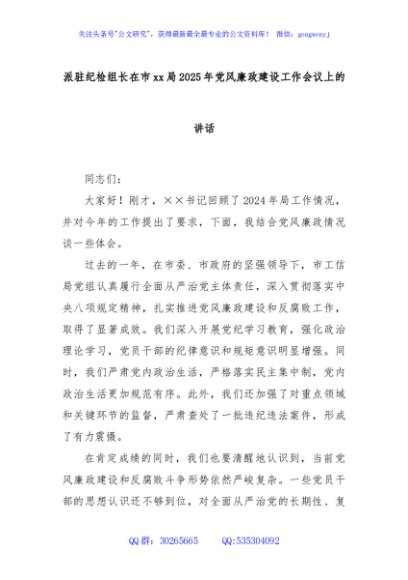 / 派驻纪检组长在市xx局2025年党风廉政建设工作会议上的讲话