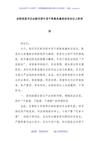 / 法院党组书记在新任职中层干部集体廉政谈话会议上的讲话