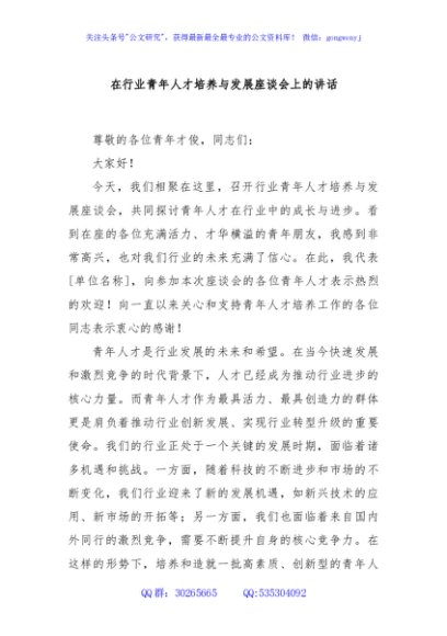 / 在行业青年人才培养与发展座谈会上的讲话