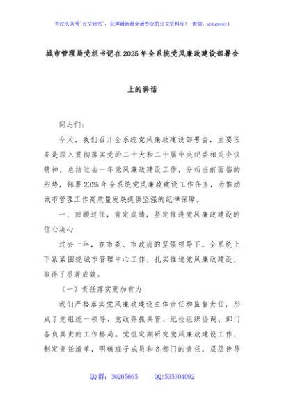 / 城市管理局党组书记在2025年全系统党风廉政建设部署会上的讲话
