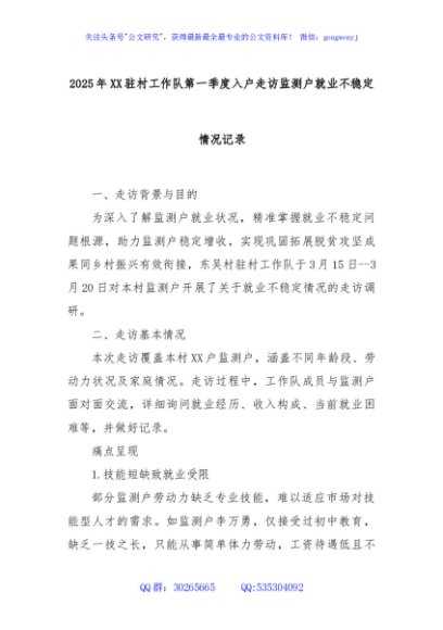 / 2025年XX驻村工作队第一季度入户走访监测户就业不稳定情况记录